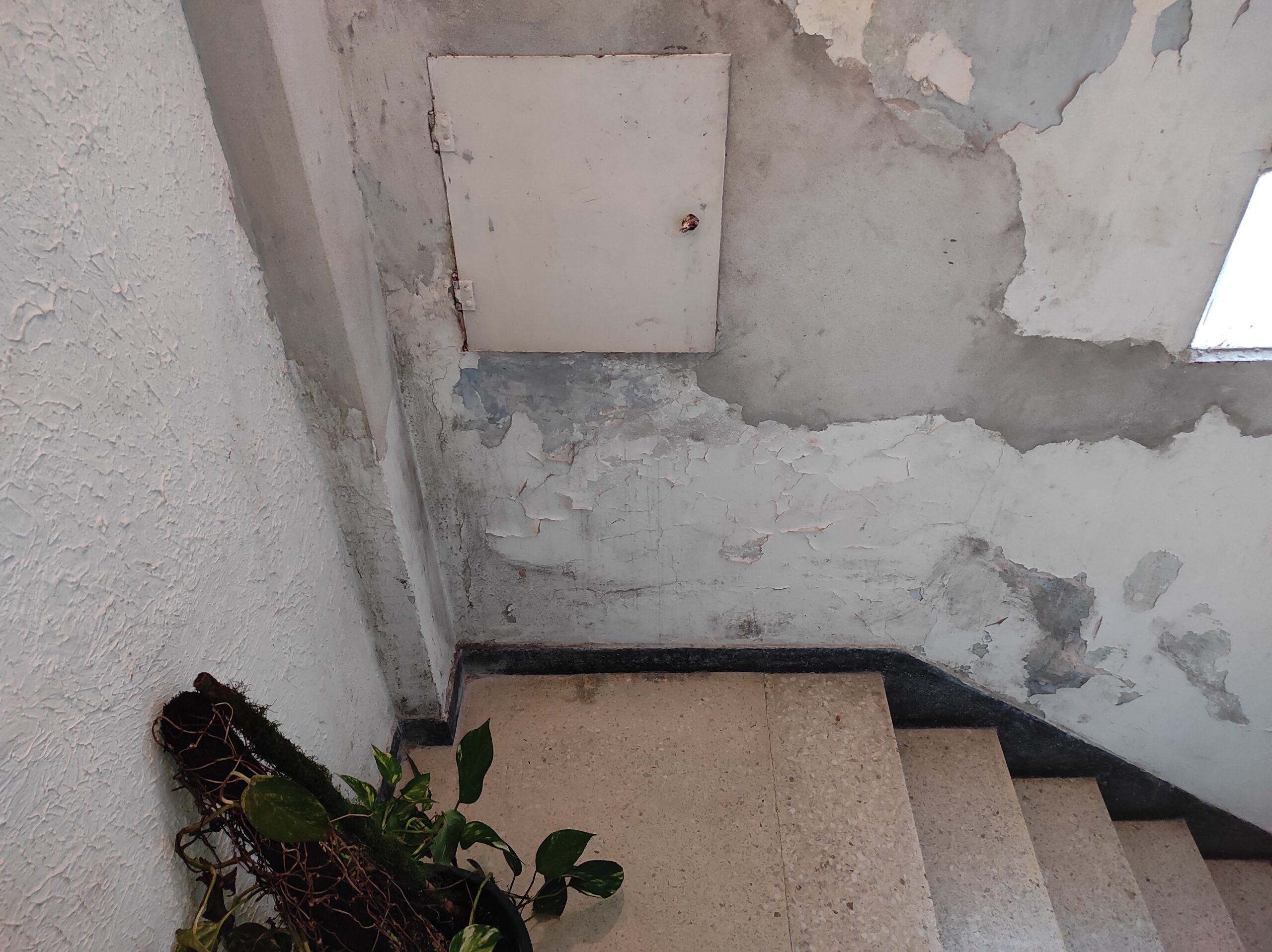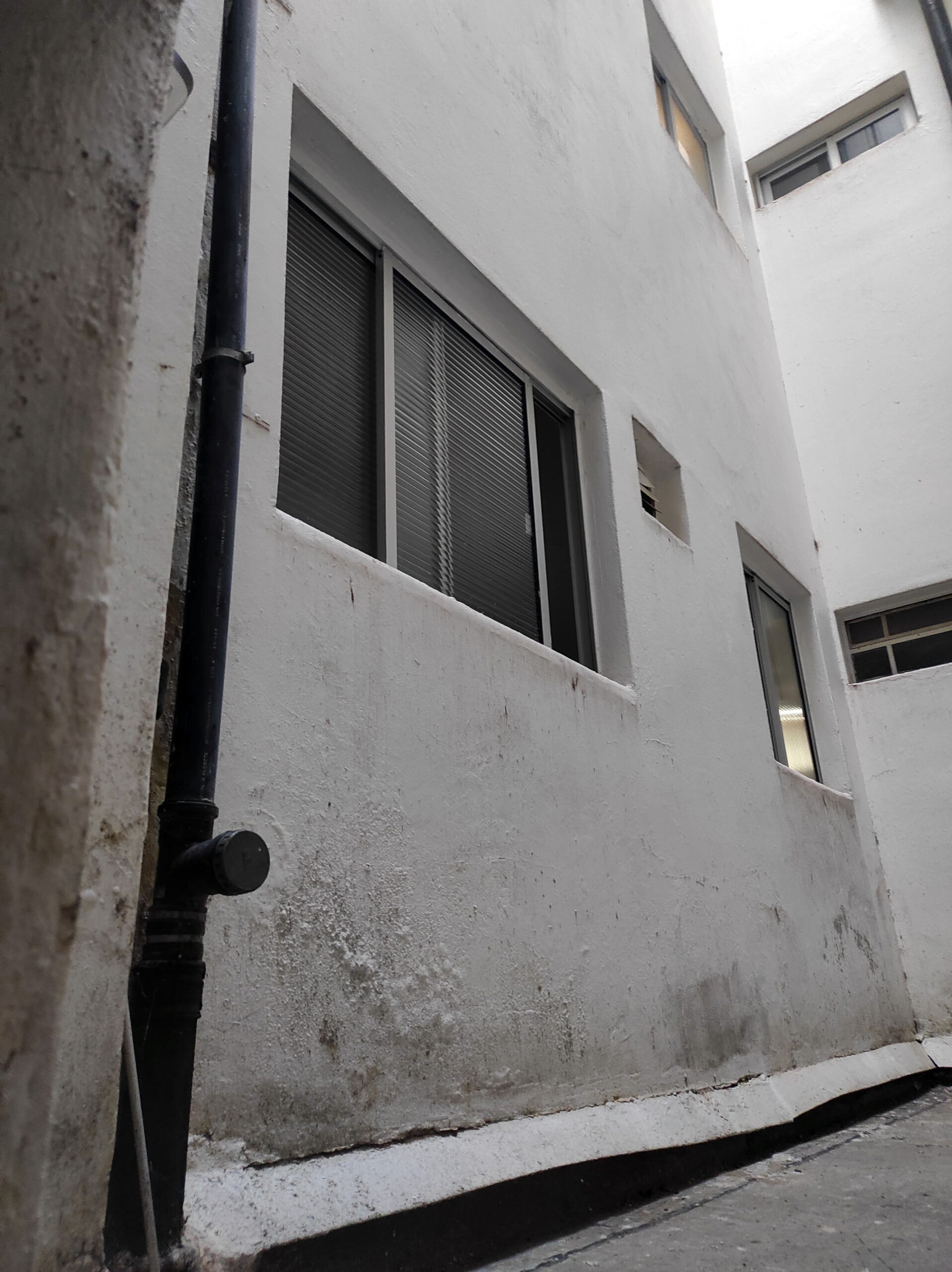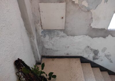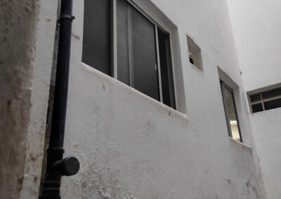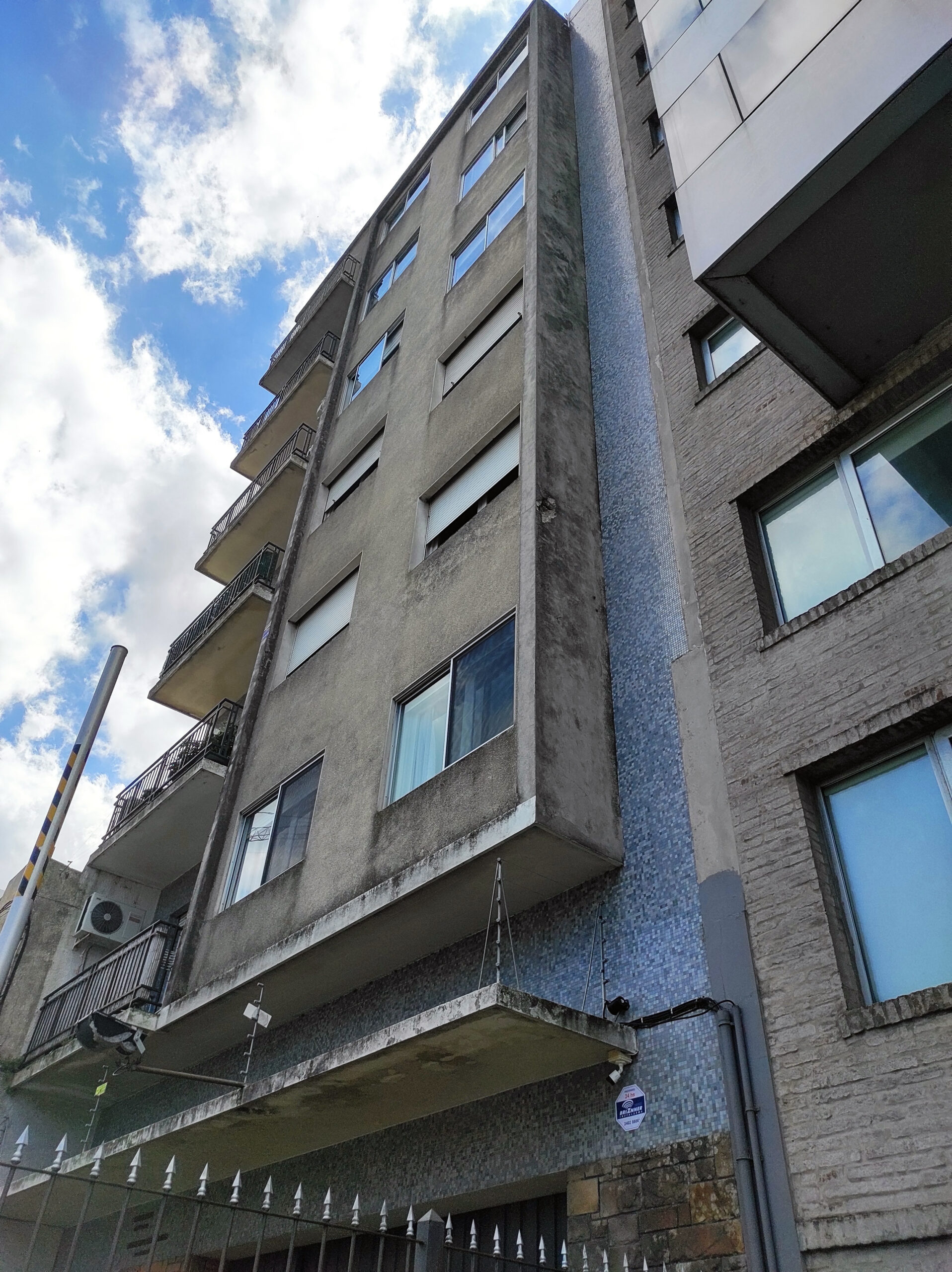El sistema constructivo es tradicional, de mampostería y estructura de hormigón armado. Las condiciones de borde que contempla son cerramientos medianeros con los otros inmuebles mencionados, siendo fachadas principales y posteriores de ambos bloques expuestas en su totalidad al exterior y la medianera compartida con la vivienda colindante expuesta a partir del tercer nivel.Presenta multiplicidad de patologías edilicias tanto en espacios comunes como en unidades, a saber: filtraciones de agua intrusa a través de las fachadas interiores al pozo de aire y de la azotea sobre tanque de agua, grietas en volumen fachada frontal, fisuras y microfisuras a nivel de cielorraso sobre caja de escalera, crecimiento de moho y biodeterioro generalizado, condensaciones superficiales e intersticiales, ampollamientos y desprendimientos de revoques y revestimientos interiores, hierros expuestos en balcones con proceso de oxidación; así como problemas de similares características en el interior de las unidades. Instalación sanitaria y eléctrica antiguas que requieren de intervención para ser llevadas a normativa actual. La terapéutica propone un abordaje integral, fundamentalmente de adición de barrera térmica y de vapor a la envolvente expuesta, recomposición de la capa impermeable y de revoques y pinturas, reparación de grietas y fisuras, hidrolavado general de fachada frontal y medianera.